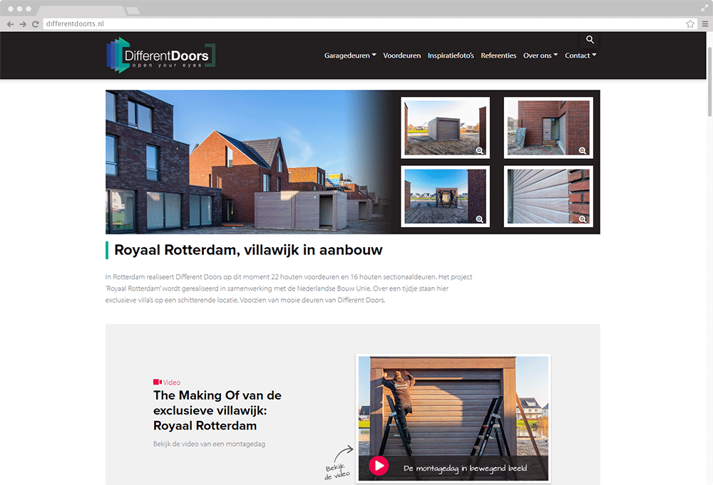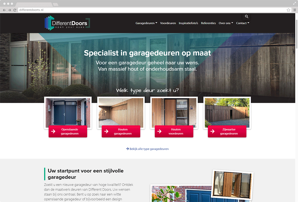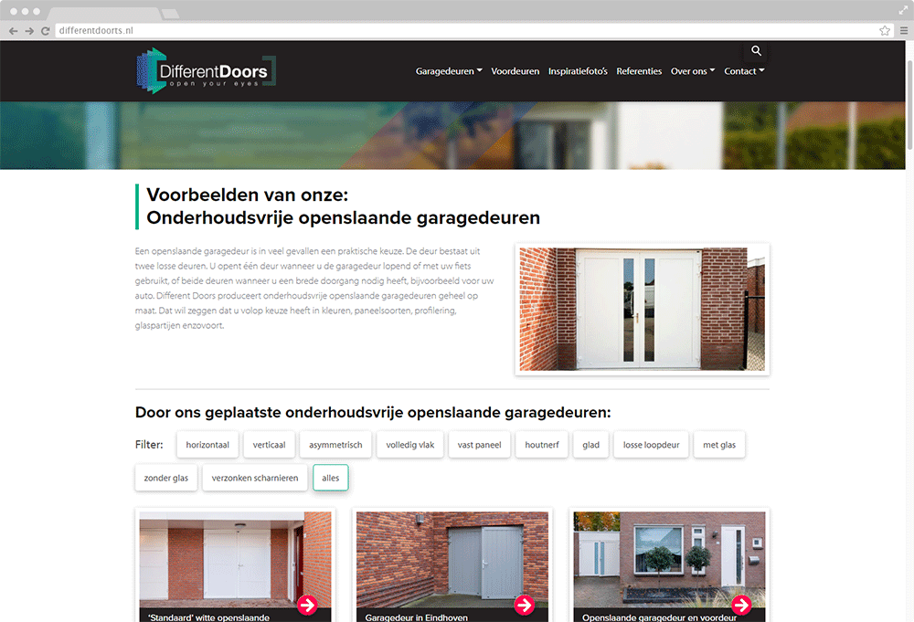De nieuwe website voor Different Doors was helemaal opgebouwd met zoekmachine vindbaarheid in het achterhoofd. Alle productpagina’s en de projecten van Different Doors werden in een interne pagina- en linkstructuur slim aan elkaar verbonden. Dit was de gouden greep om daarna de concurrentie te kunnen verslaan.